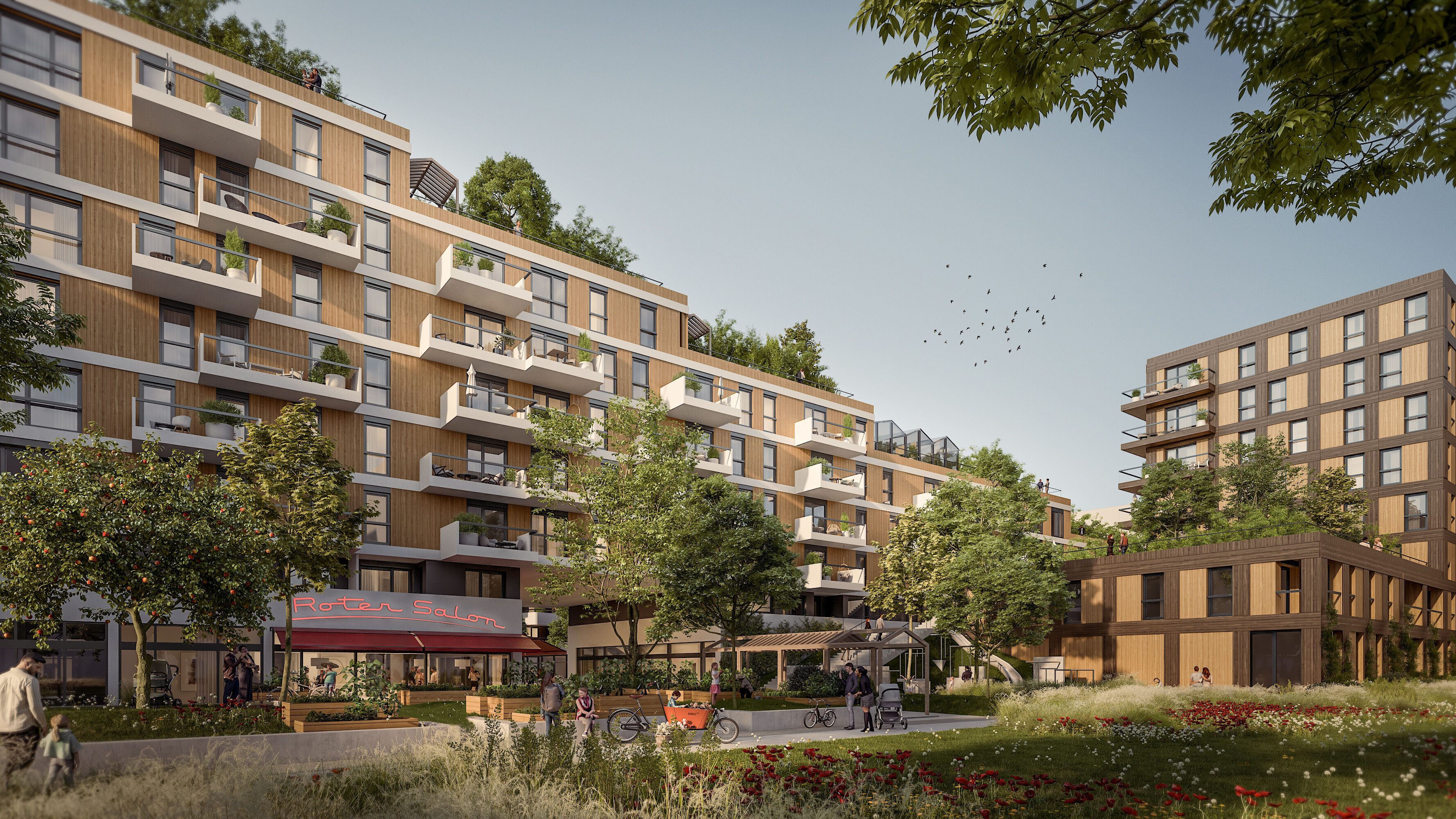 - Ein „Roter Salon“ dient als gesellschaftliches Zentrum der Anlage mit angebundenem Kinderspiel- und Bewegungsraum, Werkstatt und Waschküche.
