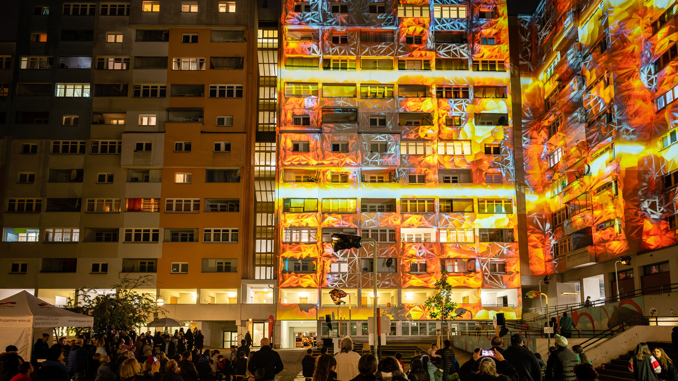Speziell für die Wohnhausanlage Thürnlhofstraße hat das Künstlerkollektiv „Hand mit Auge“ eine spektakuläre Fassadenprojektion geschaffen.