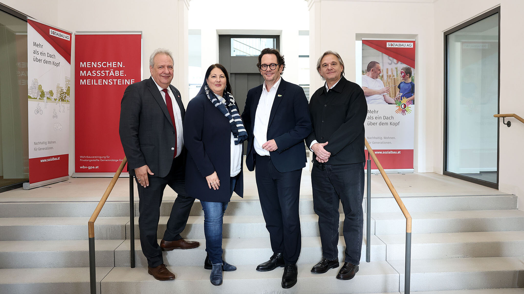 Michael Gehbauer (WBV-GPA-Geschäftsführer), Kathrin Gaál (Vizebürgermeisterin und Wohnbaustadträtin), Markus Reiter (Bezirksvorsteher Neubau), Hannes Stangl (SOZIALBAU-Direktor)